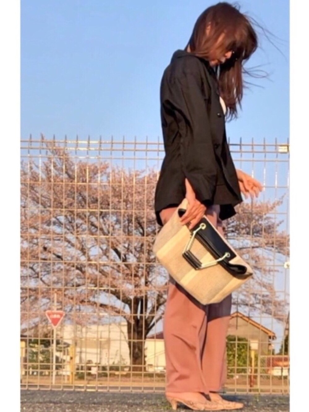 着回しです🍃 風が強すぎる😆 髪めっちゃくちゃ💦 サファリジャケット引っ張り出しました🧥 バッグをクラッチ風に👝 小物で柄柄コーデ❤️ ピンクのパンツが🌸とかぶってる 袖まくりも戻ってる🙄💦 🌸もちっちゃいそう😭