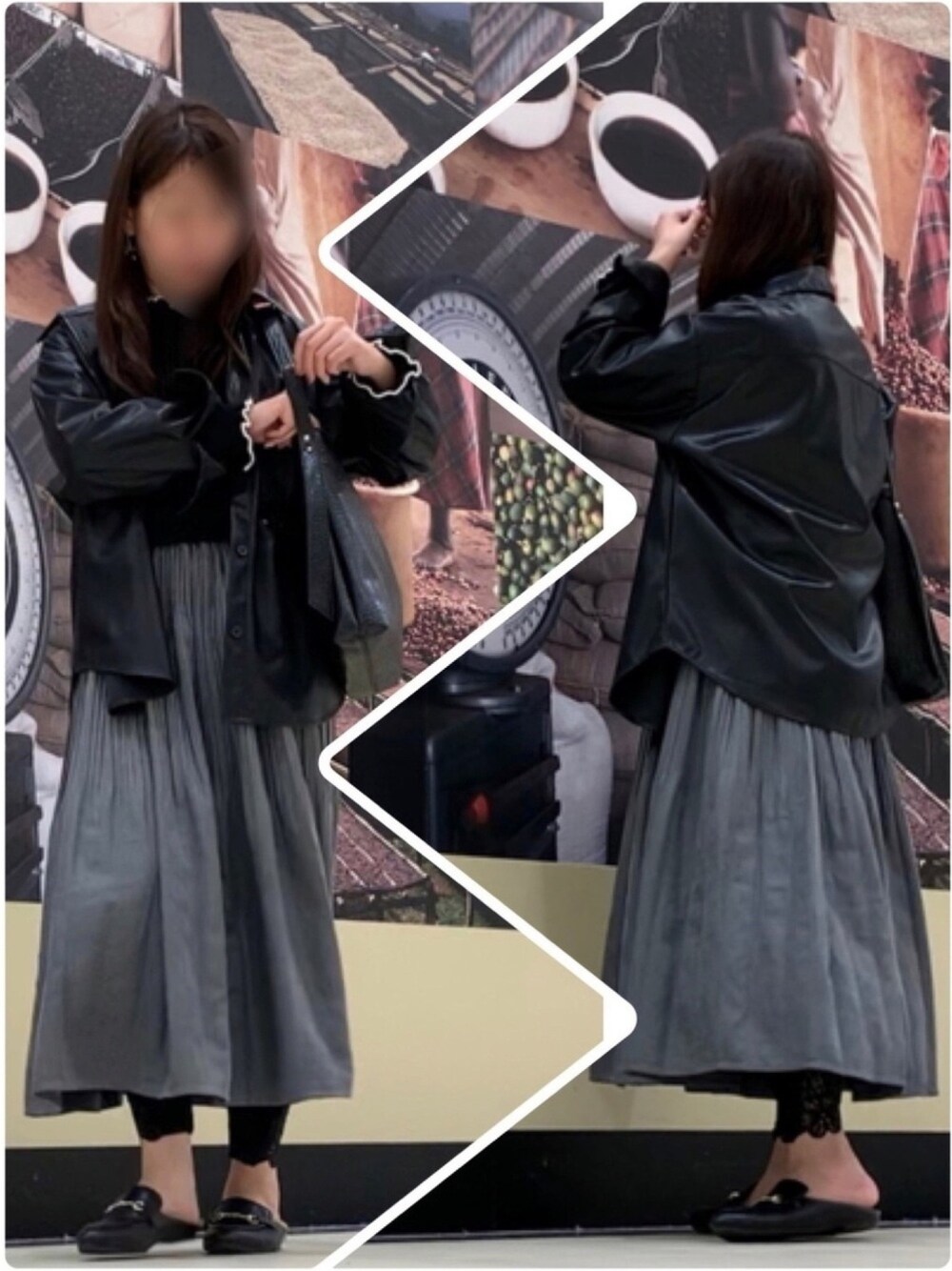 フェイクレザーシャツの着まわしと このグレースカートおニューです✨ いい色味でしょ? 消しプリーツみたいな感じで丈感もすごい好き❤️ 寒いからレギンス履いたよ🤣 黒多めでコーデしてみました🕶 少しレア感あるかな🙃