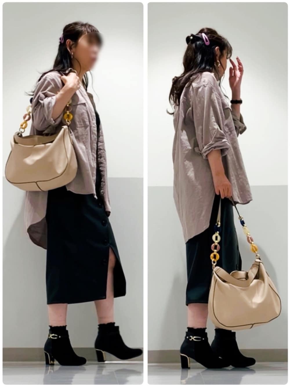 フェイクレザータイトスカート だけどタグに乗ります🏷 それとエアリーコーデュロイシャツ すごい柔らかくて色味もピンクベージュで 大好きな色❤️ 落ち着きます💛 仕事中レギンス履いてたから 後残ってる🤣 この戻りが年々直ぐに戻らなくなります🤣