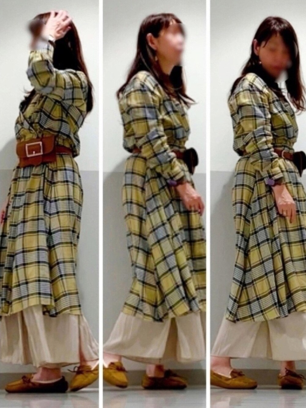 久々にモカシン引っ張り出して バックルポーチてウエストマークして.色あわせて✨ スカートパンツ履いて🙃 チェックのワンピとレイヤード✨ 所々ブラウンに差し色に腕時計⌚️ ワンピシャツの合わせ方をアレンジしてきてます💛 もう少し試着した時ほっそり見えたのに なんかおデブ🐷💦 今朝もアウター必要でしたね、この上に ボアジャケの濃い目のデニム着て行きました✨