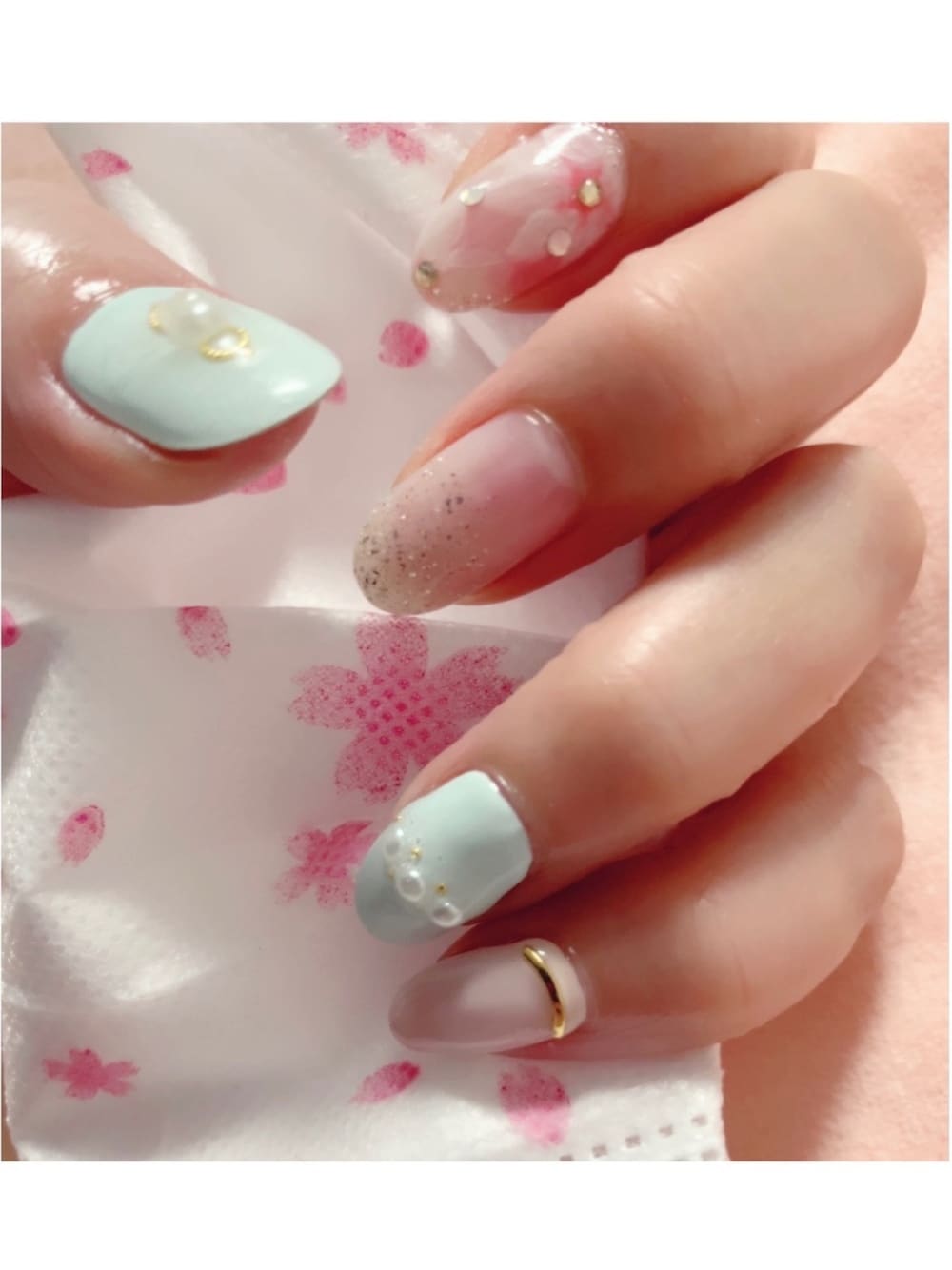 今月のジェルネイル🌸 載せ忘れてました😓 🌸と大好きな淡い色味にパール🦪 パールって品もあり女の子感満載❤️ 関東は🌸が今満開になりそう☺️