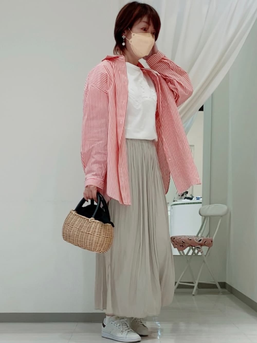 暑いのか寒いのか 晴れてるのに☀️なんか寒かったり コーデも難しいですね😂 今日はプチプラのあやさんのコラボテイに オレンジ色のストライプシャツに カゴバッグ👜👝持ってみました❣️ 明日も仕事だぁ〜😭