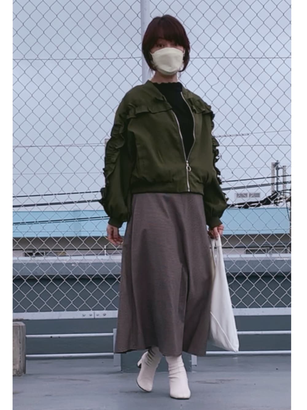 お店のma1 きてみました😍フリフリで丈間短くて可愛い💚 曇りで画像良くないですが☁️📷💦 いつもいいねフォロー❤️ ありがとうございます☺️ 更年期で少し凹んでましたが 少しずつ元気になってきました😆 スカートはチェック柄なんですが 見にくい🧐 カメラ目線😂 お許しください🙏ね