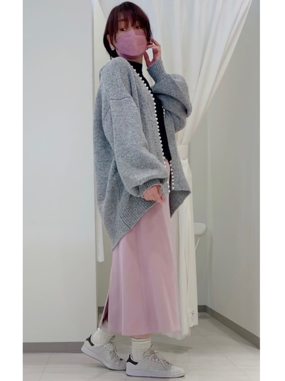 このパールカーディガン シルエットが可愛過ぎた❤️ パールとかレースとか大好きすぎる😍 このピンクのスカートも大のお気に入り💕 しわにもなりにくくシルエットも綺麗だし❤️