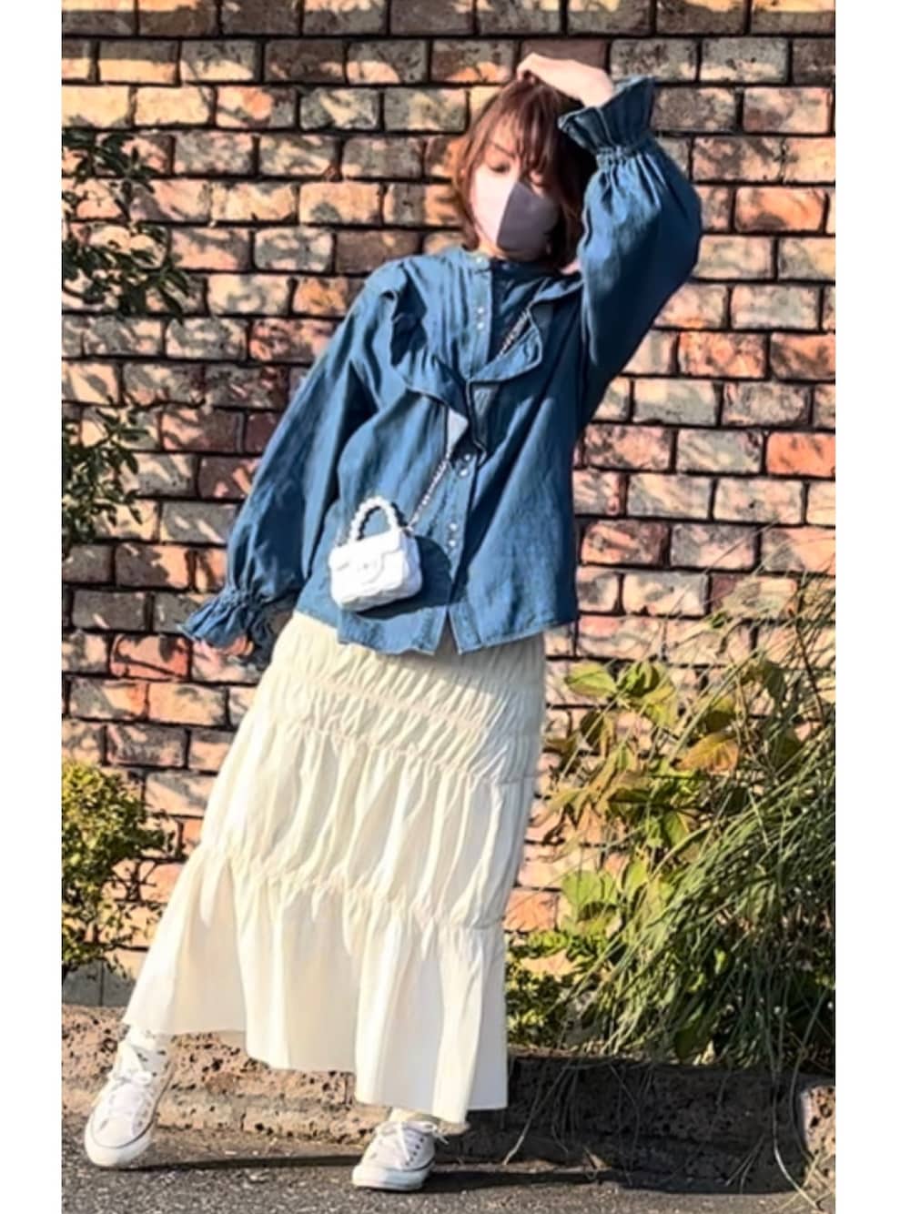 この39マートのミニバッグ 可愛すぎる🤍 それとSHEINのパールのリボンピアスと この花柄の靴下 ヒートテックで足元冷えないし花柄って可愛い🌼 前回のスカートの着回しです☺️