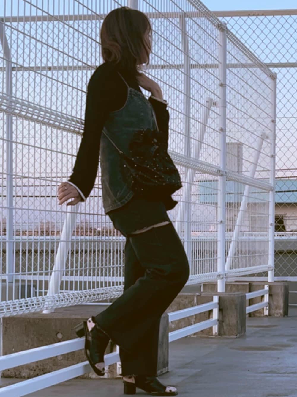 ワントーンコーデ🖤 わかりにくいですがデニムの黒のビスチェ重ねてます🐦⬛ ほぼカラスみたい🐦⬛だ😭 ☁️だったから画像が😭 カカトとつま先の出たブーツにシースルーの靴下合わせで パックはキルティングのスパンコール付きです✨ よく見えてないのが残念ですが載せちゃいます☺️