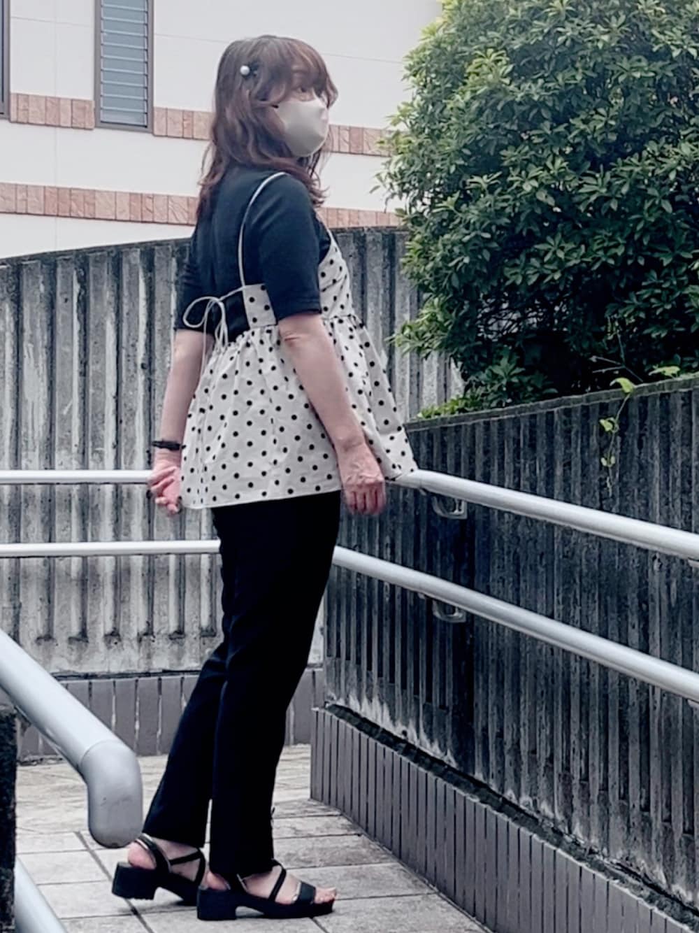 バッグ👜置き忘れてます🤭 ベージュのポリエステル素材のキャミに ドット柄黒とパンツの黒とサンダル合わせてます🖤 胸元は浅いハイネックティに袖も長めにしました🙆♀️ このcocaさんのパンツ前のスリットの上🎀ついてて可愛くて履きやすくてストレッチも良くセンターラインで足長効果 グレー🩶と悩んで2枚買い♡🤭