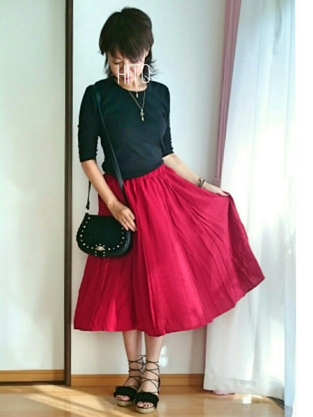 こにゃにゃちわ😃 赤と黒のコ―デ cepoさんの上下トップスゎ露出少な目で五分袖大人っぽくて好きです😃 そして一目惚れで買った赤のスカ―トテンション上がりますよね✨⤴❤ うしろが少し長めでお気に入り🎶 このコ―デライブに着ていこうかと思ってましたが着たくなって試着しちゃったぁ⤴😁 子供みたいですよね😅 いつもフォローコメントセ―ブ❤ありがとうございます😆💕✨ 又寄ってくださいね✨