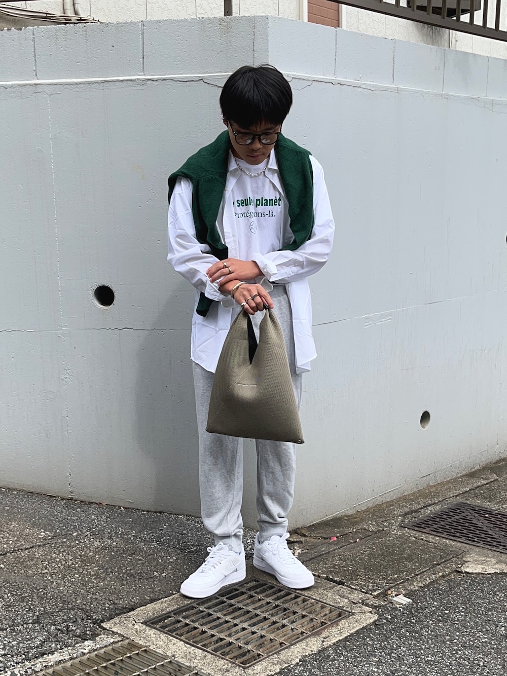 シティボーイを意識したコーデ。 スウェットパンツを履く時は基本シャツみたいなキレイめなアイテムと合わせるようにしていてカジュアルさを中和しています◎ シャツとスウェットパンツだけでは物足りなく、ロゴtのロゴの色味を拾って緑のニットを肩掛けしてこなれ感を演出してみました!