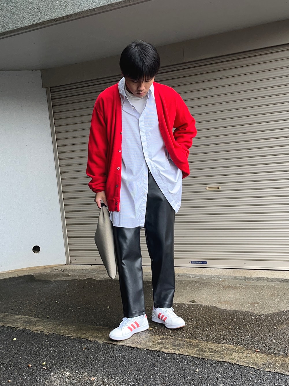 赤とレザーの合わせは中々バチバチで決めすぎて見えてしまうけど、オールスターの外しがいい塩梅に中和してくれてる😲 個人的にこのコーデの配色好き✌︎·͜·