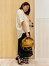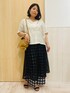 【サイズ感】 160㎝の私が着用して、パンツはくるぶし位の着丈です。 【素材感・着心地】 ドレープシャツは、レーヨン混特有のドレープ性があり、さらりとした着心地です。 しわが気になりにくい表情のある質感もポイントです。 チェックプリーツパンツは、さらっとしたタッチの素材にチェックのプリントを施し、ウェーブ風のプリーツ加工を施しています。 レーススカートは、幾何柄のレース調素材を使用しています。表のレース調スカートと裏地がセットになっており、着用してるのは表のレース調スカートのみです。 【おすすめポイント】 ドレープシャツは、身体のラインを拾いにくいシルエットで腰回りからヒップをきれいにカバーし、二の腕がしっかり隠れる袖丈も嬉しいポイント。前を閉じた着こなしから、開けて羽織りとして着るなど、残暑が厳しい時期から秋まで着られるアイテムです。 チェックプリーツパンツは、サッと脱ぎ着しやすいウエストぐるりゴム仕様も魅力の一つで、ややワイド寄りのシルエットで脚のラインを拾いにくく、安心して穿いていただけます。 レーススカートは、すっきりしたフレアラインなのでレイヤードしても膨らみすぎず、体型カバーにもオススメです。 【スタイリングポイント】 レーススカートとパンツをレイヤードしてコーデしました。