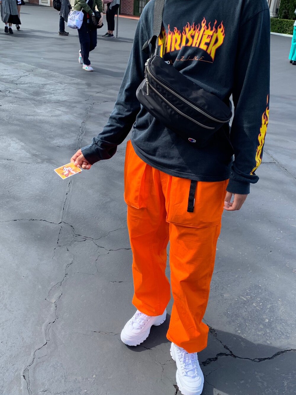 Disneyland🏰 ・ ・ ・ FILAの厚底にGUと三代目のコラボズボン、上のTHRASHERのロンTは古着! ちなみに帽子もTHRASHERのファイヤー。