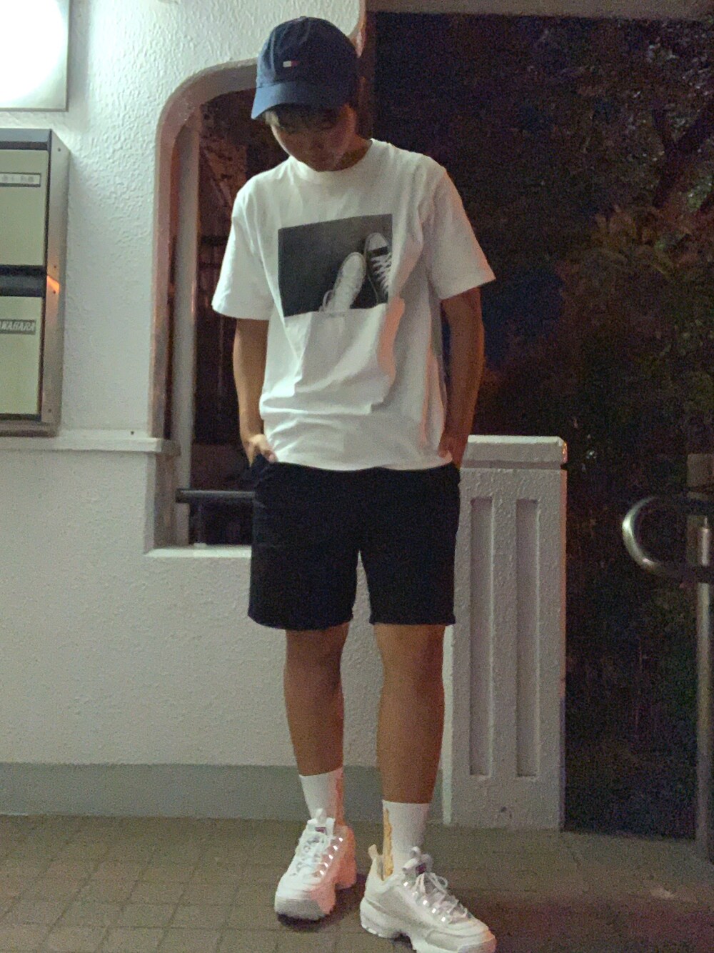 夏が来た。 tommyのキャップ CONVERSEのTシャツ foreverのズボン SPINNSのソックス FILAの厚底! シンプル!