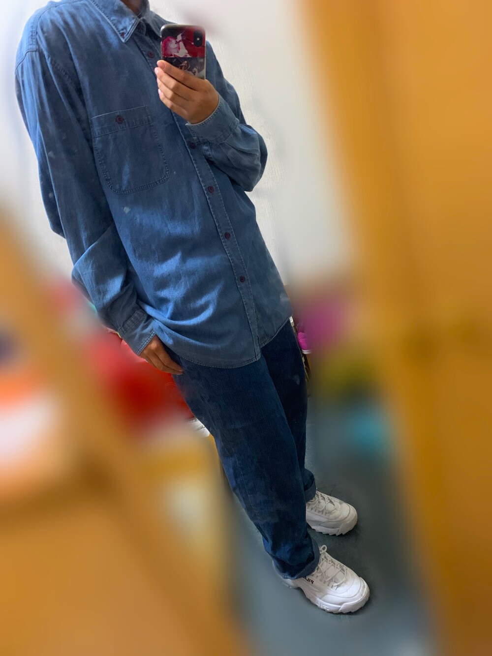 上下古着です。デニムonデニム。ラフな格好です。バイトに行っただけです。 FILAの厚底は使い勝手良すぎてしょっちゅう履いてます。