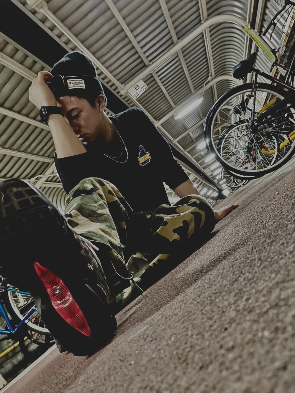 黒ロンT×迷彩パンツ アクセント:ニット帽(黒)