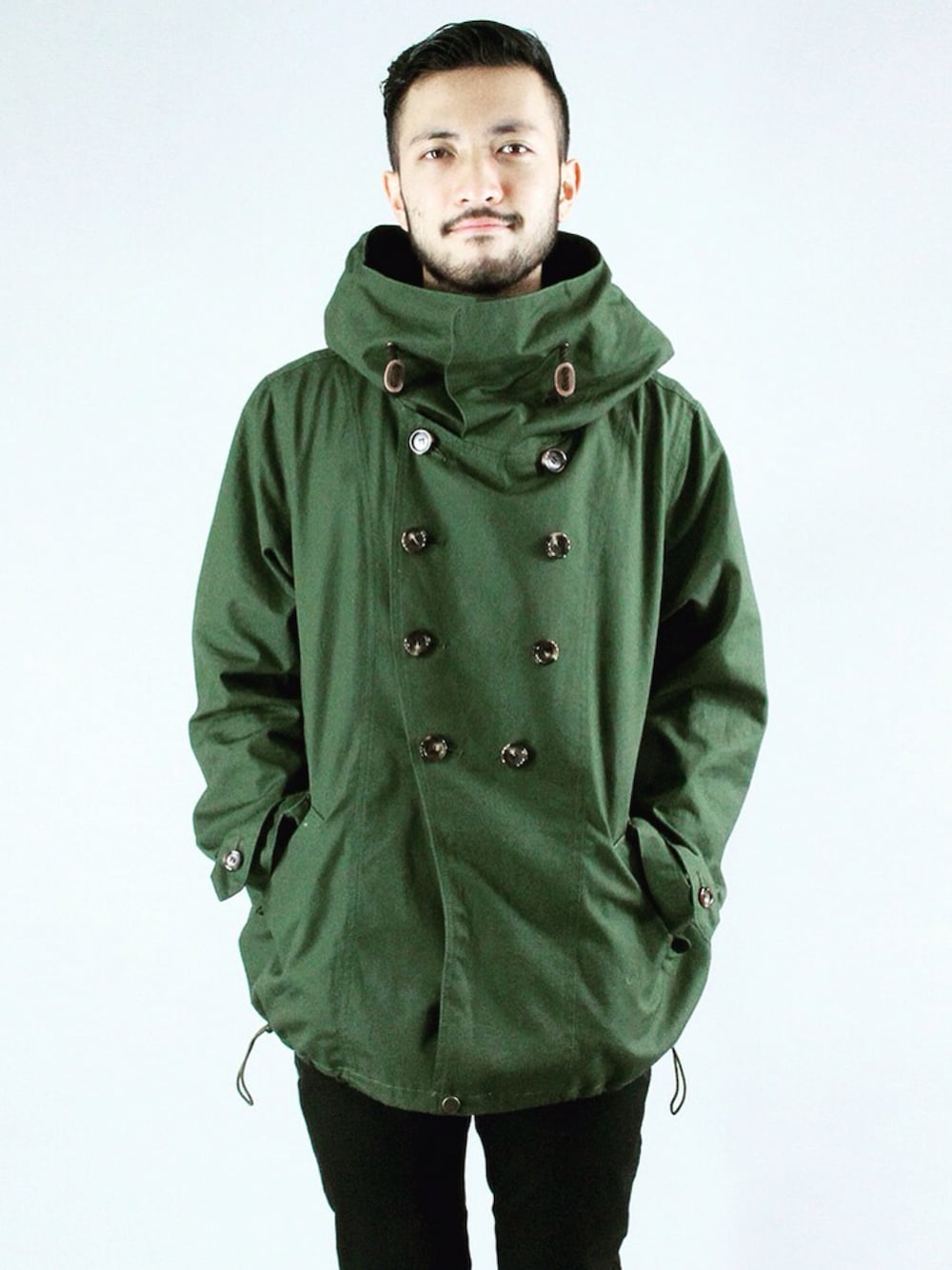 グリーン系のマウンテンパーカーを着用したメンズの夏コーディネートの1枚目の写真