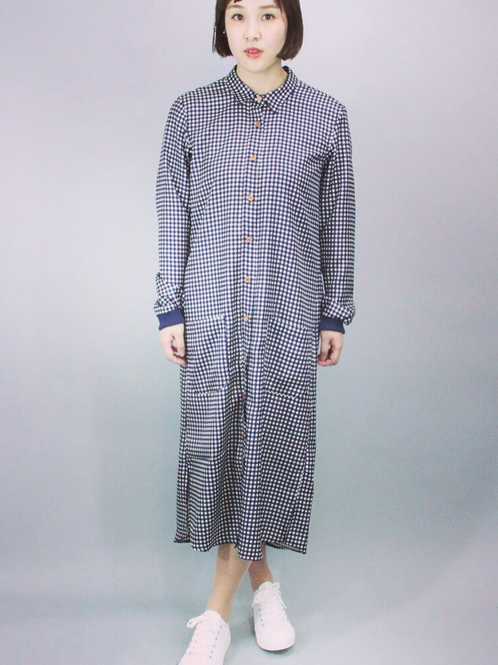 ブルー系のシャツワンピースを着用したレディースの夏コーディネートの1枚目の写真