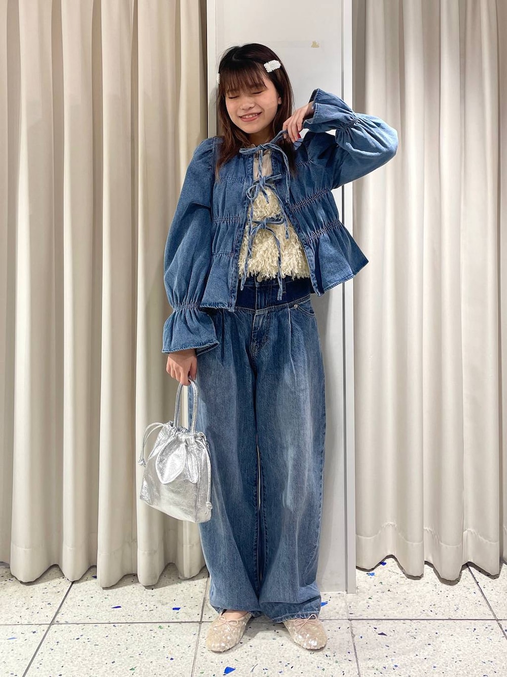 デニムセットアップコーデです👖💙 同トーンのデニム合わせなのでシルエットで勝負!🥣 ⭐各アイテムのおすすめポイント  ̄ ̄ ̄ ̄ ̄ ̄ ̄ ̄ ̄ ̄ ̄ ̄ ̄ ̄ ̄ ̄ ̄ 【トップス】 ほんっとうに可愛すぎるシャーリングトップス!前後2WAYでお使いいただけます♡ 程よく柔らかいデニム素材なので着やすさも◎です! インナー次第で雰囲気が変えられるので着回し力も抜群です!! 【ボトムス】 カーブデザインが綺麗なデニムパンツ👖ダブルウエストデザインがかわいいです♡ 腰からヒップにかけてゆとりがあるので体型カバーにもおすすめです! 表にタックが入っているのでカジュアルすぎないところも推しポイントです✨157cmでMサイズを着用しています! 使用アイテムはすべてこのページの下からチェック、ご購入できます🕊💌是非お買い物楽しんでください♡!