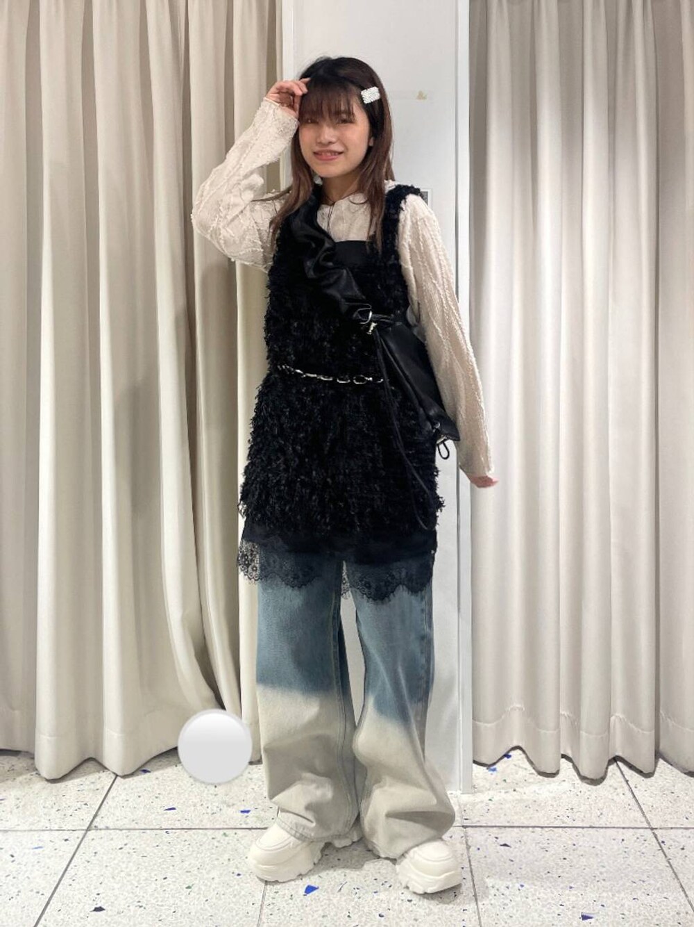 ローライズデニムのルーズさとトップスのレイヤードを活かして甘辛コーデにまとめました🎀🖤 【ローライズデニムパンツ】 股下が長めで裾がたまるようになっているトレンドのローライズデニム!157cm骨格ウェーブでMサイズを着用しています🙋🏻♀️ローライズデニムなので、ウエストは緩めに感じましたが、厚底スニーカーと合わせると引きずることなく穿けそうです👖 ︎ ✰︎コーディネート全体のポイント ・ 大きめシルエットのデニムパンツに着られている感が出てしまわないようトップスはコンパクトに、色は黒を選んで締まるよう意識しました✨ メリハリを出すためにウエストはベルトでマークしたところもポイントです◎ フェザーのノースリーブの中に、レースキャミを仕込んでおしゃれなレイヤードスタイルに🪄︎︎ 使用アイテムはすべてこのページの下からチェック、ご購入できます🕊💌是非お買い物楽しんでください♡!