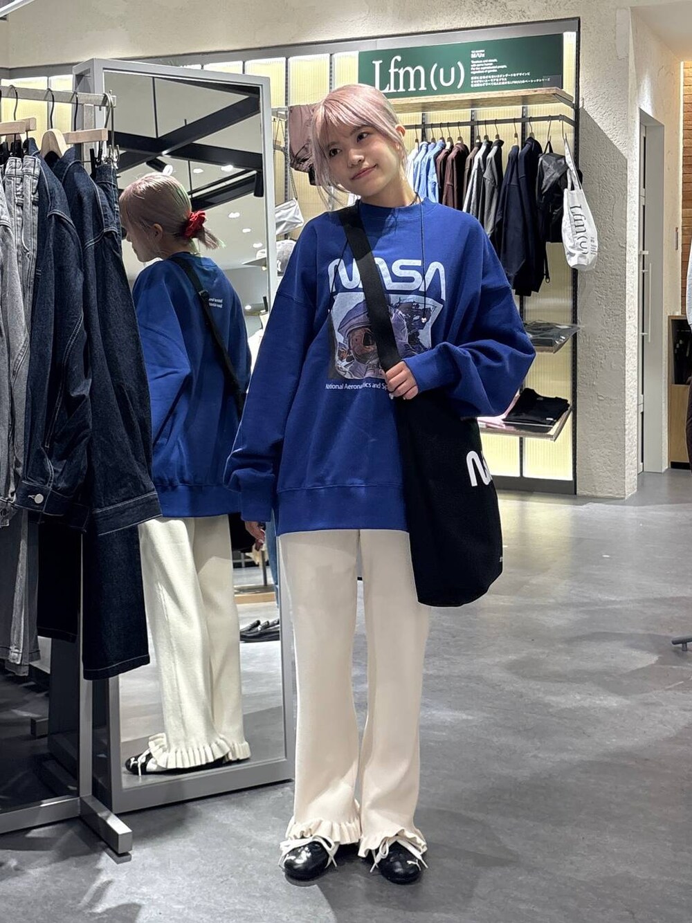 ご覧いただきありがとうございます! 157cm 骨格ウェーブ Mサイズ着用 LFM(U) NASAコラボアイテム🪐 トレンドのフォトプリントが印象的なゆるっとスウェット。 大きなNASAのロゴと、バックの刺繍もポイントです。 フレアパンツ合わせは勿論、ミニ丈でワンピース風に着るのもおすすめです😌 使用アイテムはこのページの下からチェック・ご購入できます🪽 staffboard毎日更新中!フォローお待ちしております✉️ Instagram