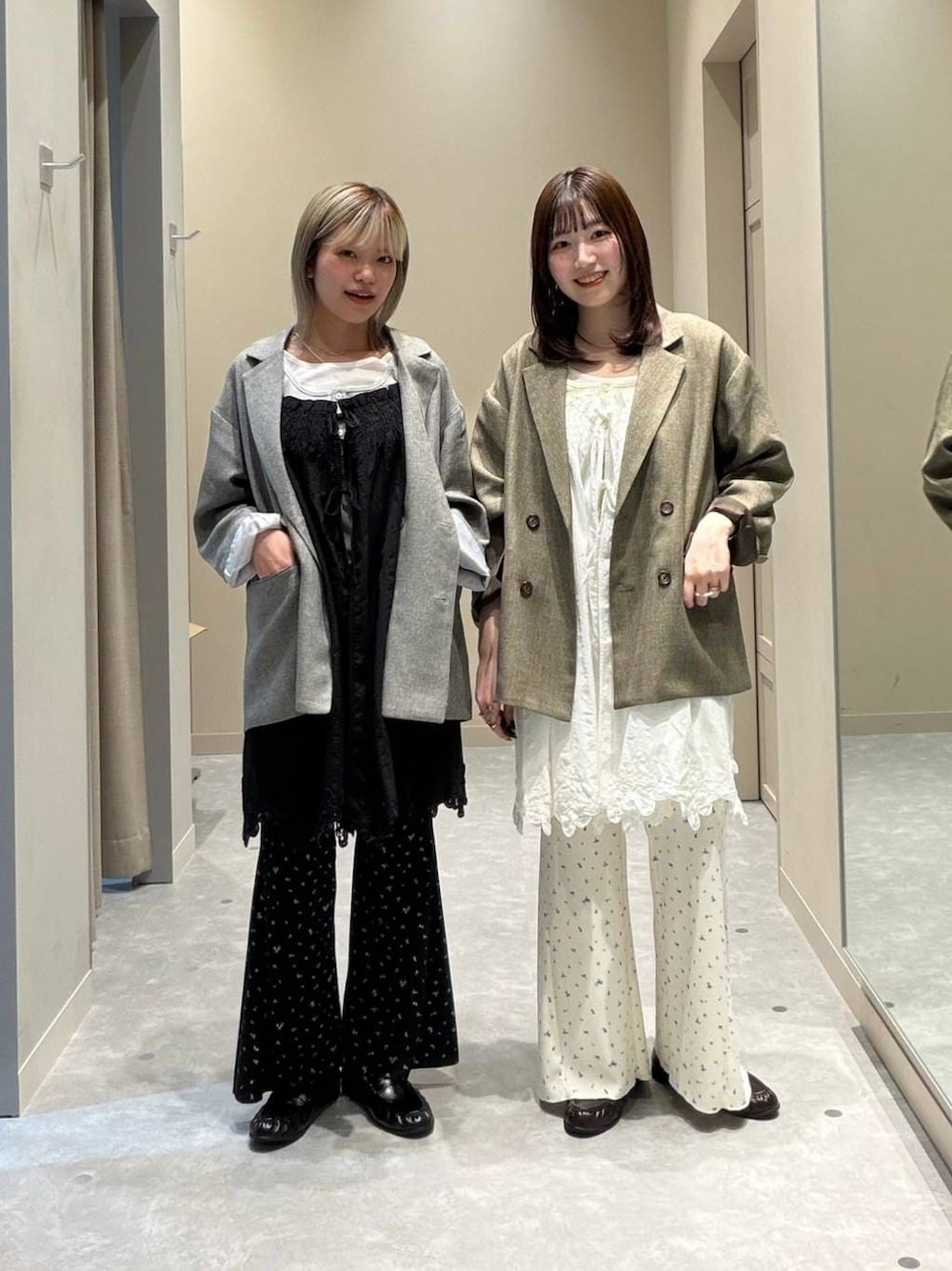 🏷️カラー別コーデ 右 manaty.さん 160cm 骨格ストレート 左 yuico 157cm 骨格ウェーブ ジャケット×レースキャミでトレンドコーデ☘️ フレアパンツでバランスにこだわりました🙂↕️ 使用アイテムはこのページの下からチェック・ご購入できます🪽