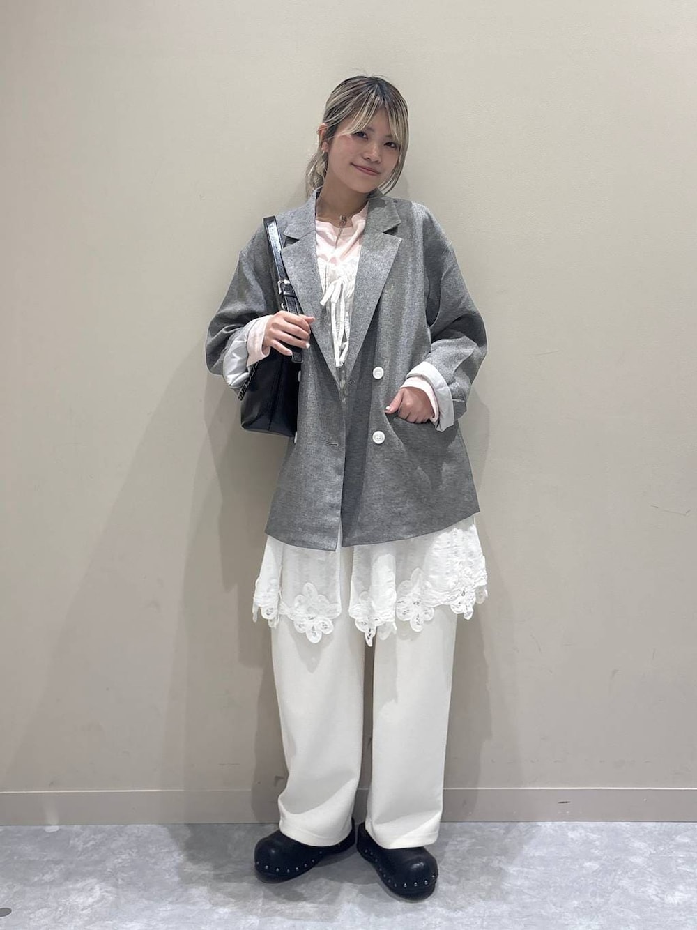 今着たい甘カジュコーデ🫖🎀 157cm 骨格ウェーブ かっちりジャケットにスウェットパンツのラフミックス感がポイント! トレンドのレイヤードアイテムは、シンプルコーデにプラスするだけで1段上のおしゃれコーデにしてくれます🙂↕️ 使用アイテムはこのページの下からチェック・ご購入できます🪽