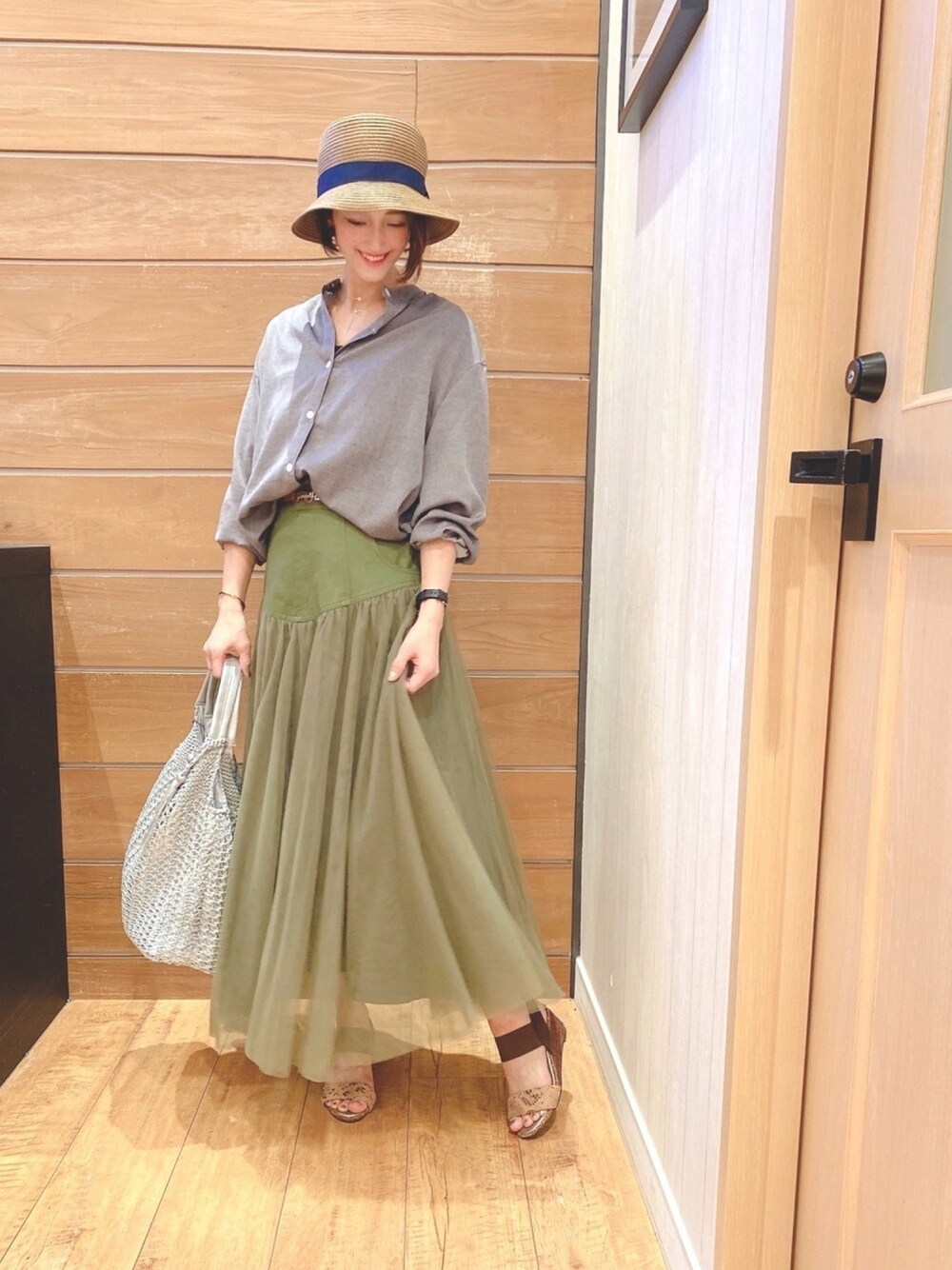 ご覧いただきありがとうございます☻ 五明さん着用シアー素材シャツのご紹介です✨ 人気のとろみあるシアー素材シャツはとても柔らかく軽く涼しく🍀これからの季節におすすめアイテムです〜♪ チュールドッキングスカートに合わせ大人なガーリースタイルにまとめてみました^^