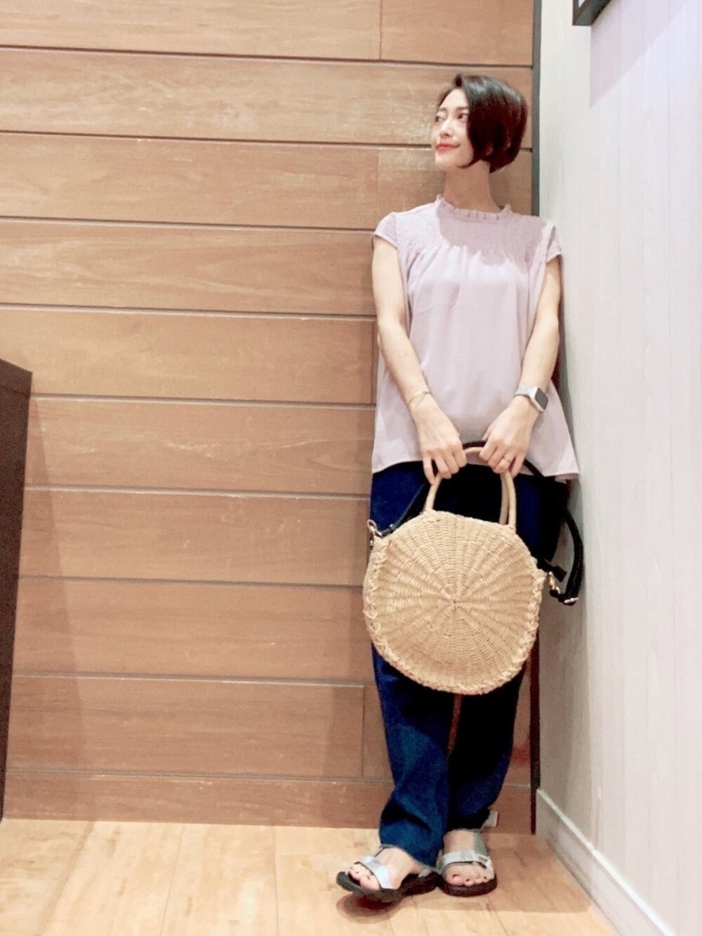 ご覧いただきありがとうございます☻ 甘辛コーディネイトご紹介🍀 人気のプチ襟にフリルとシャーリングが可愛い印象のブラウス。夏に嬉しいサラッとした質感にシワになりにくい素材です✨ 腕も少し隠せる嬉しいフレンチスリーブ♪ カットオフデニムパンツにスポサンを合わせカジュアルMIXコーディネイトにしました^^