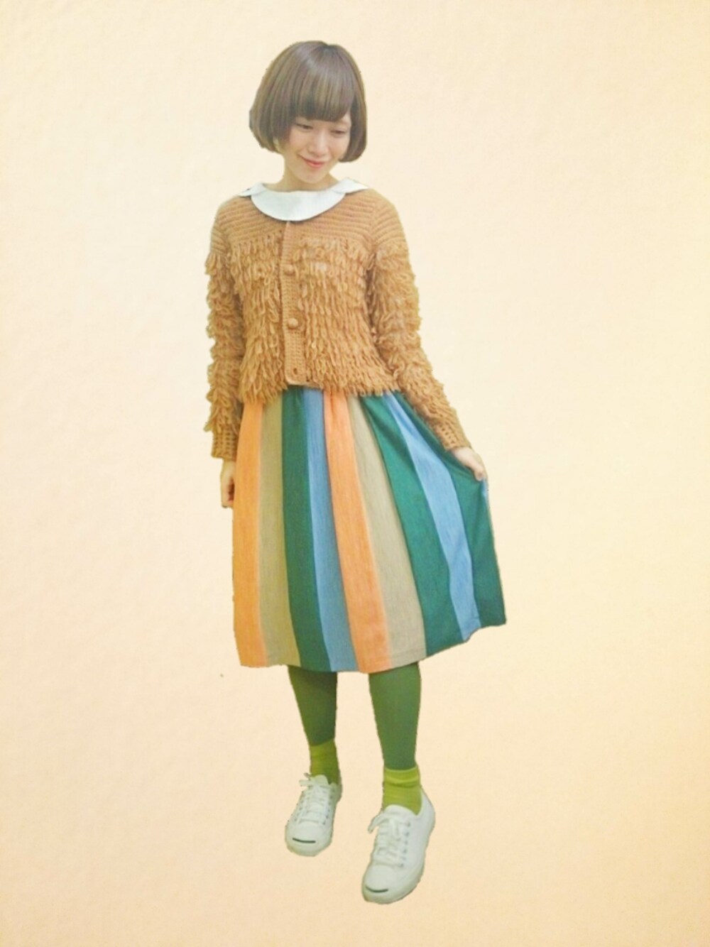 ご覧いただきありがとうございます (灬˘╰╯˘灬)♥。・゚ お気に入りのプードル風ニットジャケットに、カラフルなストライプスカートを合わせてほっこりカラフルスタイルにしてみました😀 カラータイツと白スニーカーで春らしさを。。 😮💕 コメントのお返事が遅くなってしまってごめんなさい。少しずつお返しさせていただきます (*´―`*)