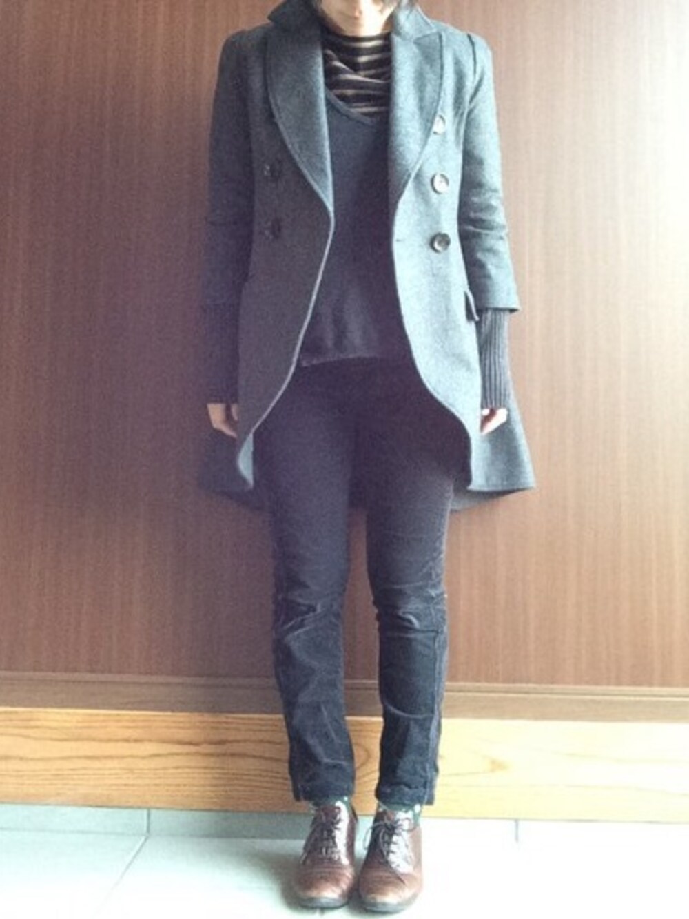 妊婦用の黒スキニーはコーデュロイで履きやすくて重宝してます。…でもパンパン 笑 そしてセールで買ったばかりのボーダーカットソーも、既にパンパン…笑