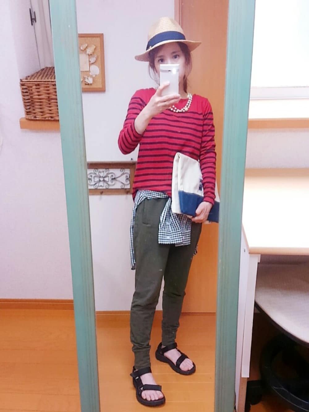 今日のコーデ💛 プチ柄×柄コーデ🎶 ボーダートップスにギンガムチェックシャツをプラス😉💕 休日なのでくつろぎスタイルのまま😅昨日も疲れ今日だけはとぐうたらしてしまう😅化粧しないし、服はかわってないけど、外出仕様に変えました😁 食料品買いに行かないと😌 お友達から誕生日にプレゼントしてもらったお気に入りのバック、これクラッチだけど広げるとチョーデカイバックになる👍😉