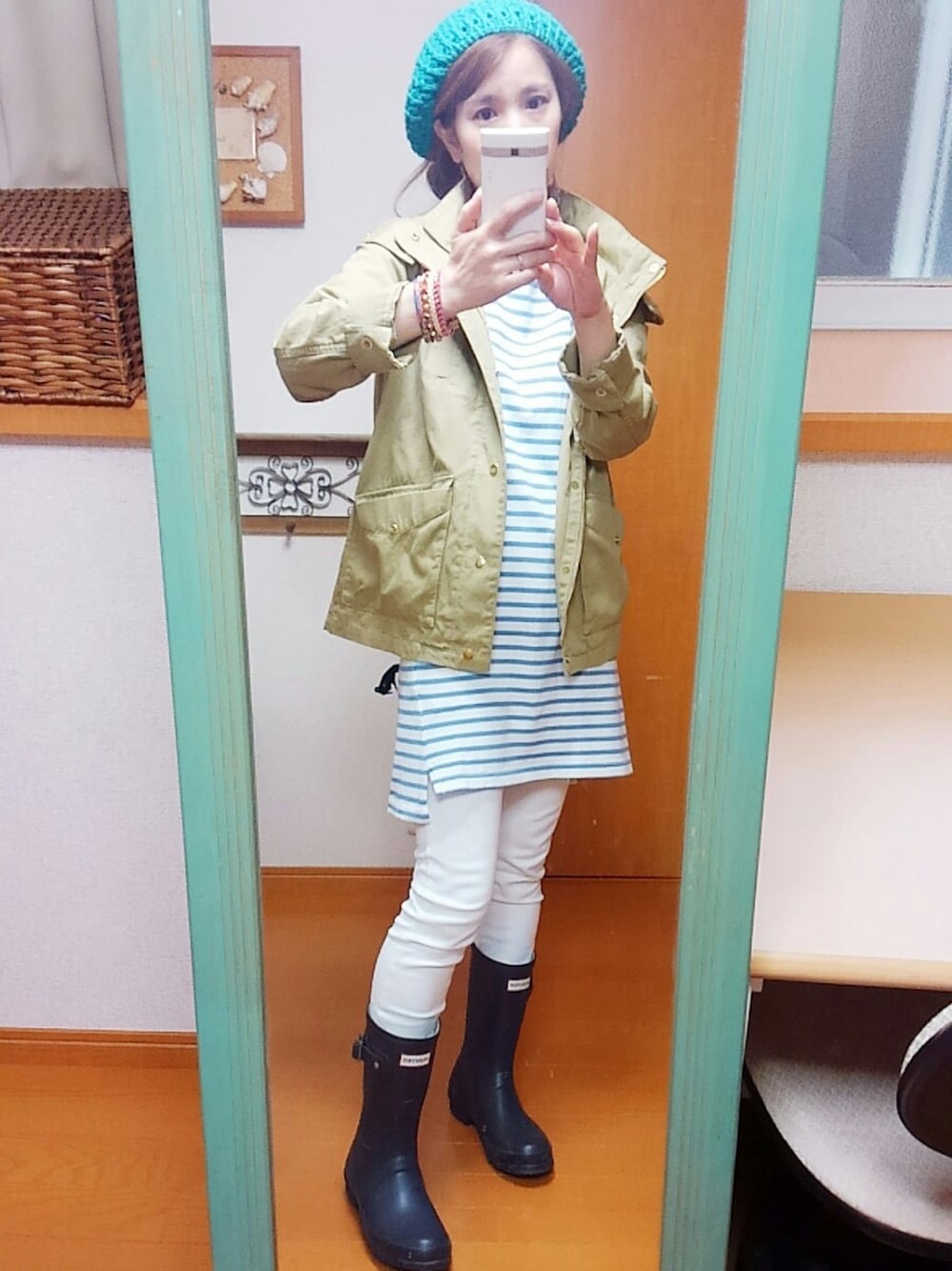 雨の日コーデ😉✨💕 派手色のニットベレー帽 外出するので長靴を履くため白スキニーを着ました😌✨