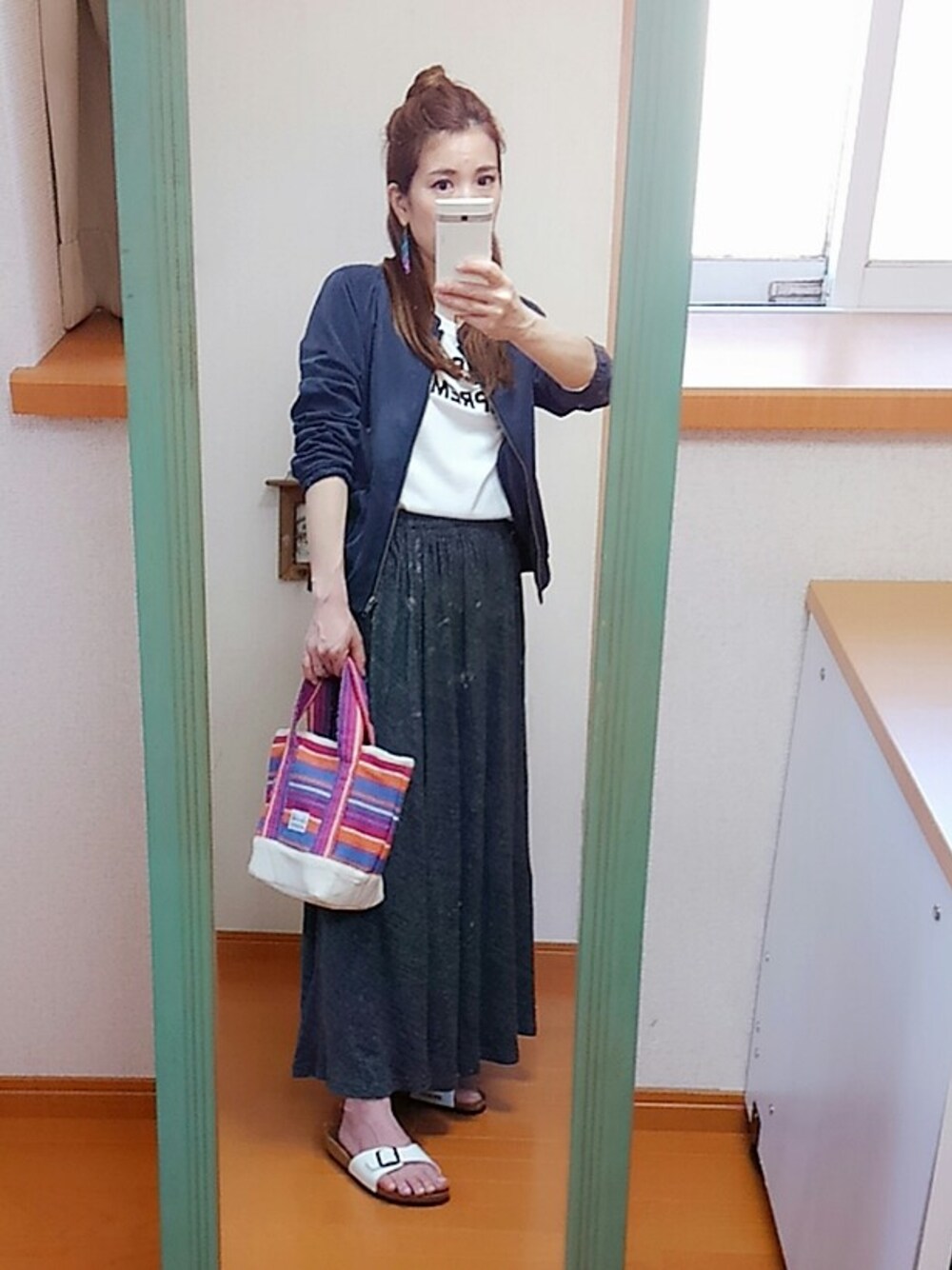 ネイビージャケットに白ロゴTとグレーロングスカート😉バックとピアスで柄や色をポイントにしました😄 このロングスカート何年か前のものだけど毎年はける定番、ギャザースカートだけど広がりすぎず◎です ピアスはビーズのフリンジっぽいデザインで気に入ってます😆💕 ヘアーアレンジはハーフアップでお団子にしました😉👍