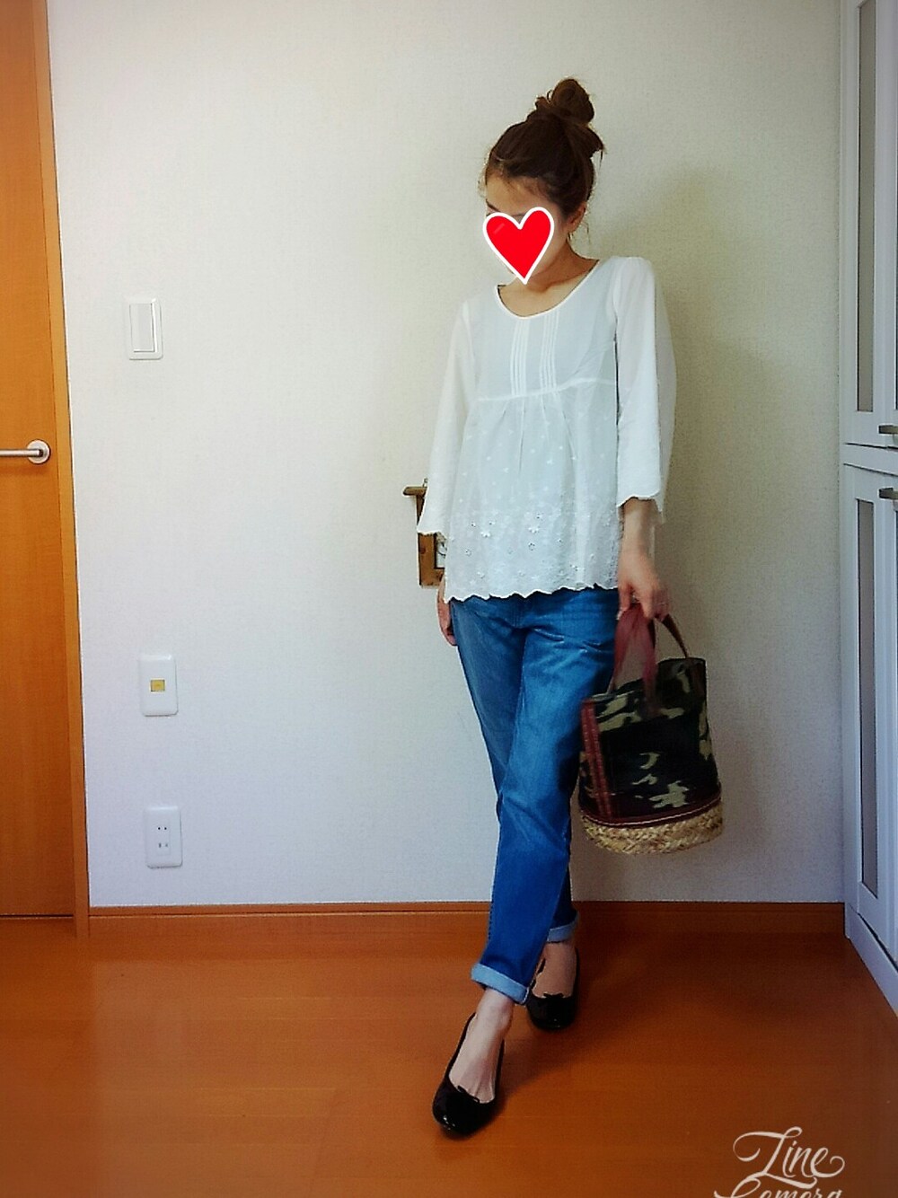 いつかの休日コーデ😉💕 白の刺繍ブラウスを定番アイテムとカモフラ柄のカゴバックでカジュアルなコーデにしました😉 このバッグ去年購入したのですが、可愛いかったのでお友達にもプチプレゼントとして買いました😉👍 今年も同じ感じの出てました⤴⤴😆