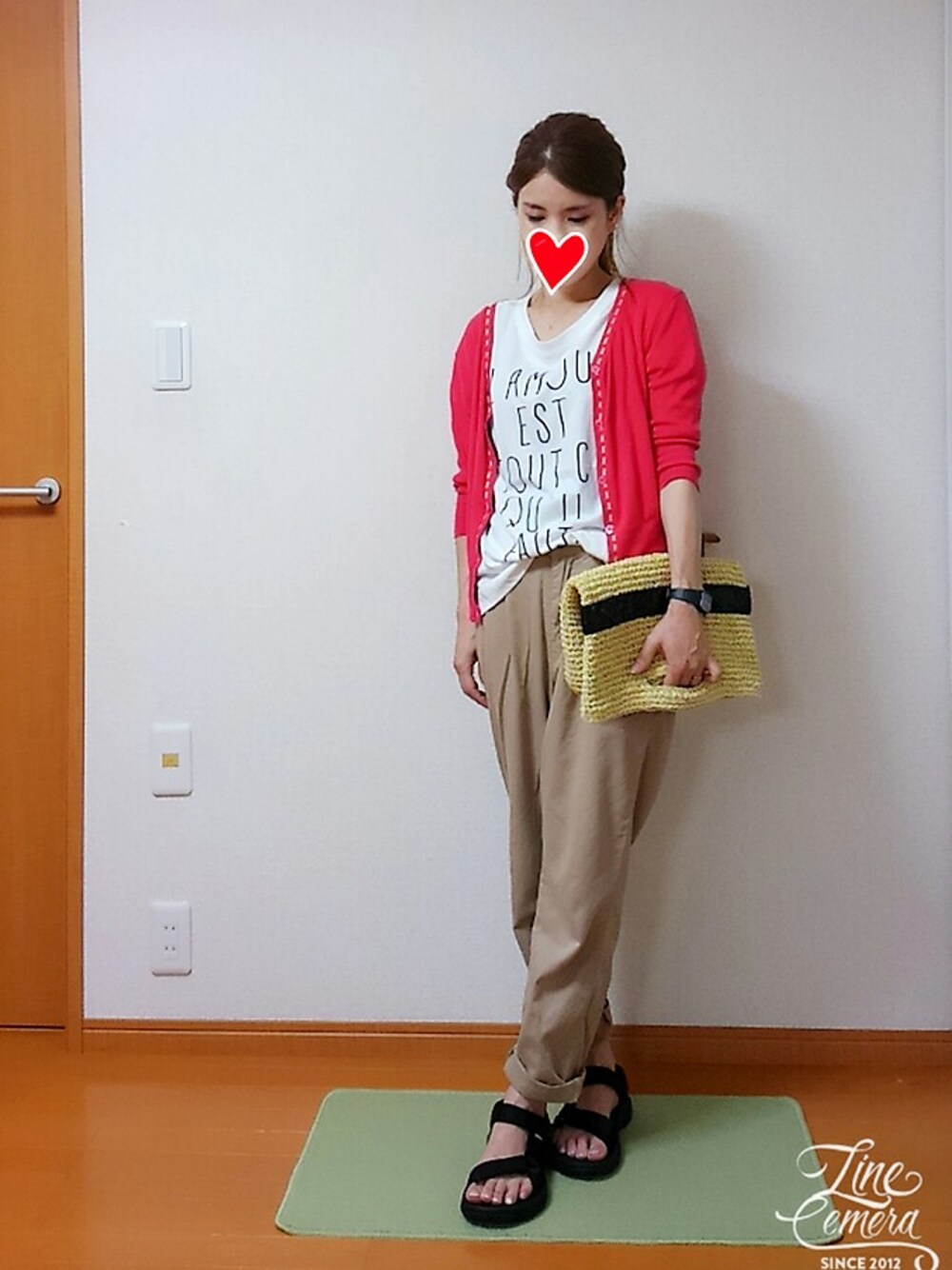 休日コーデ😉 ポールスミスの七分袖カーデ肌触りが好きです、梅雨時の肌寒い日にちょうどいいしコンパクトで持ち運びにいいです😊差し色になりました👍 Tシャツのロゴに合わせ時計やサンダルなど黒でまとめました😊小物や靴を黒でまとめるパターン結構好きです😊💕 髪は久々に真ん中分けしました😆