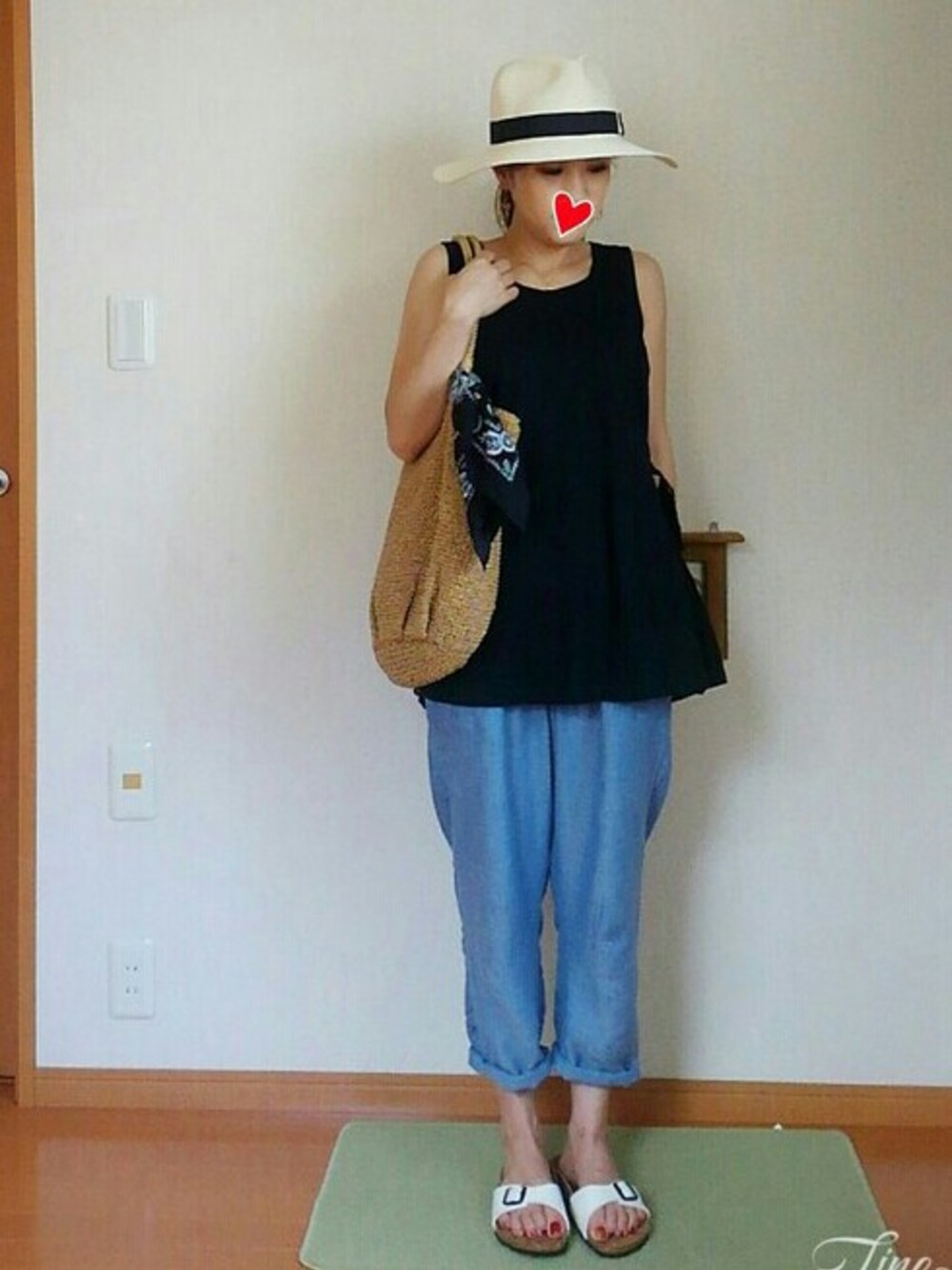 先日の休日コーデ😉👍 いつもお付き合い頂きありがとうございます💓 毎日暑いですね‼ ノースリーブに楽チンテーパードパンツでゆるゆるコーデです😁 このパンツは薄い柔らかい生地ですが透けないしめちゃくちゃ涼しいしパンツです😊🎵 JILL STUART のノースリーブはサイドがプリーツになってます、小窓にて😊