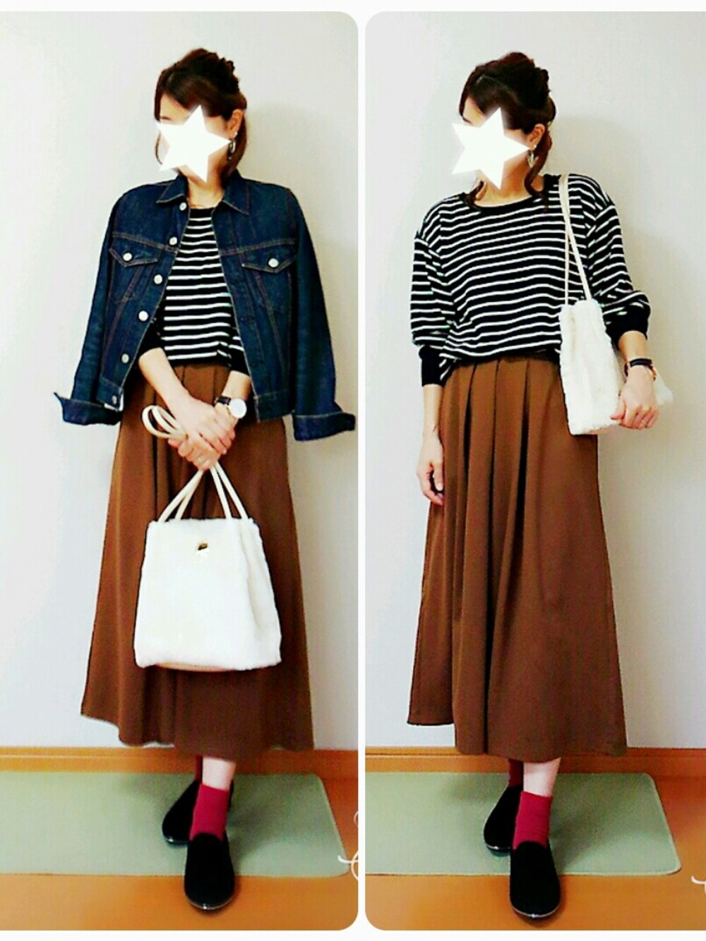 先日のコーデ😆 ボーダーニットにガウチョパンツ😊 このニット前後がリバーシブルでVネックとラウンドネック両方に使えてGood です 肌触りも気持ちいい😆‼ マジェステを使ったヘアーアレンジも小窓にて いつも母コーデご覧いただきありがとーございます😊👍