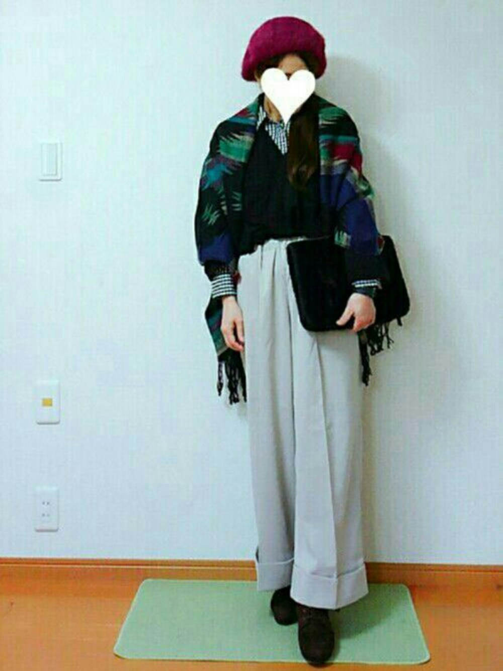 先日のコーデ😆 チョーワイドなパンツにギンガムチェックシャツ×オルテガ柄ストールプラスしたコーデ 着なれないチョーワイドパンツ、ちょっと疲れたけど新鮮でした😁💕 いつも母コーデご覧くださりありがとーございます😊💓