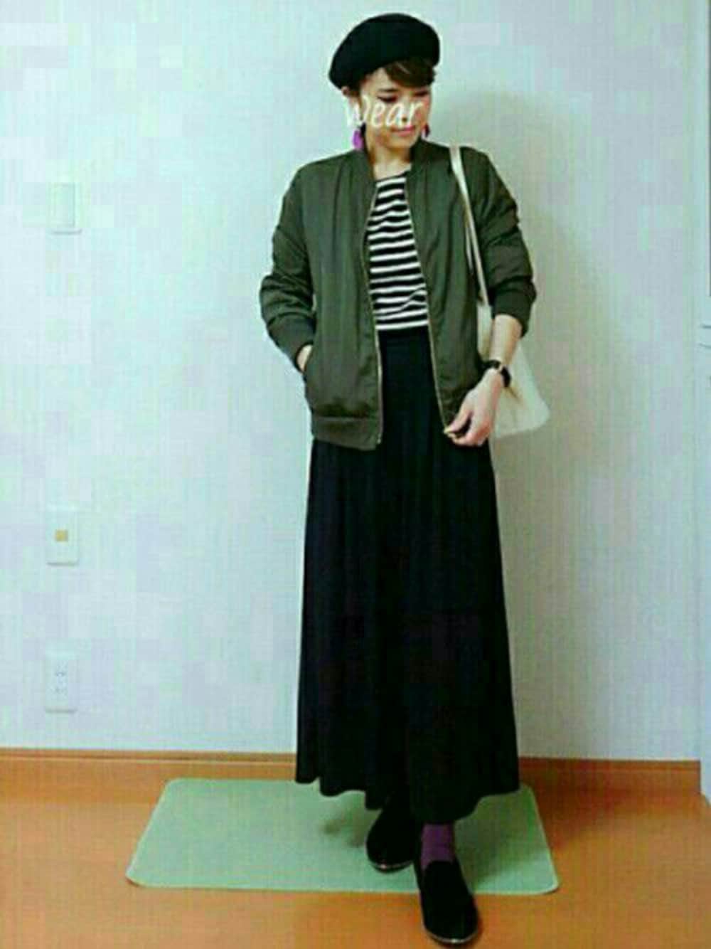 先日の休日コーデ😆 MA-1にボーダーニットにガウチョパンツ タイツとピアスの色をリンクさせて ファーバッグが持ち手が長くて肩かけしやすいし容量もちょうどいいです😉💕 夫婦でランチ😁手打ちうどんの写真も小窓にて neo-8ちゃんの🎀ピアスが凄く色が綺麗で可愛くてお気に入り、ブルーとピンクがあります、チョーお薦めです minme neo-8さんで探してみてくださいね😊 母コーデいつも見てくれてありがとーございます🙇