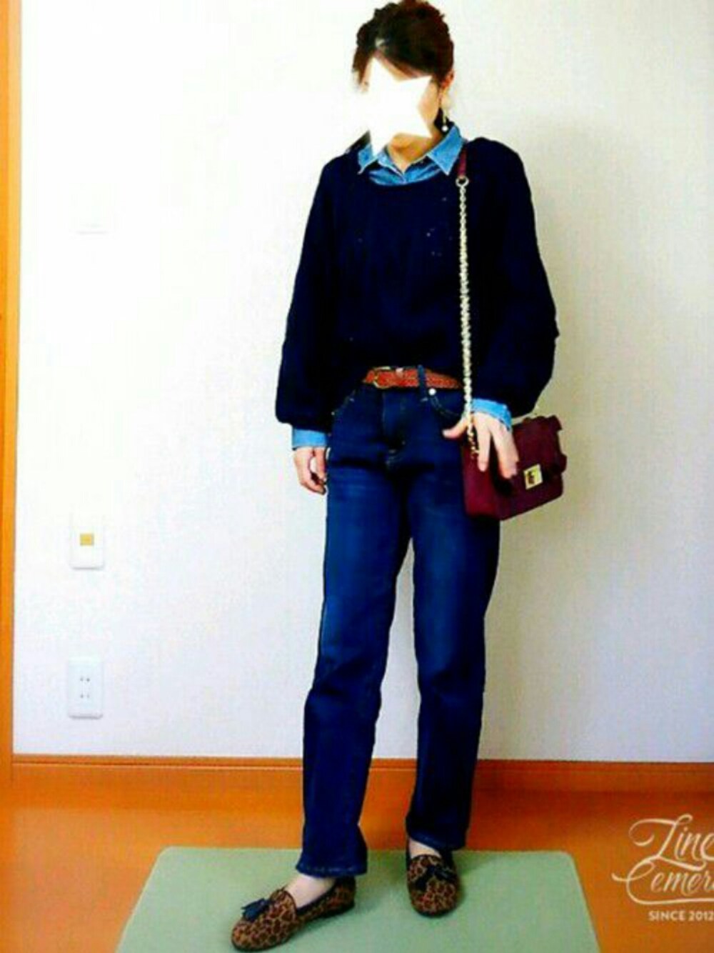 先日の休日コーデ😆 シンプルにニット×デニムです ミニショルダーのボルドーが差し色、靴で柄物をポイントに💕ファーピアスとマジェステで今年らしくしました いつも母コーデみてくださってありがとーございます😉🎵‼