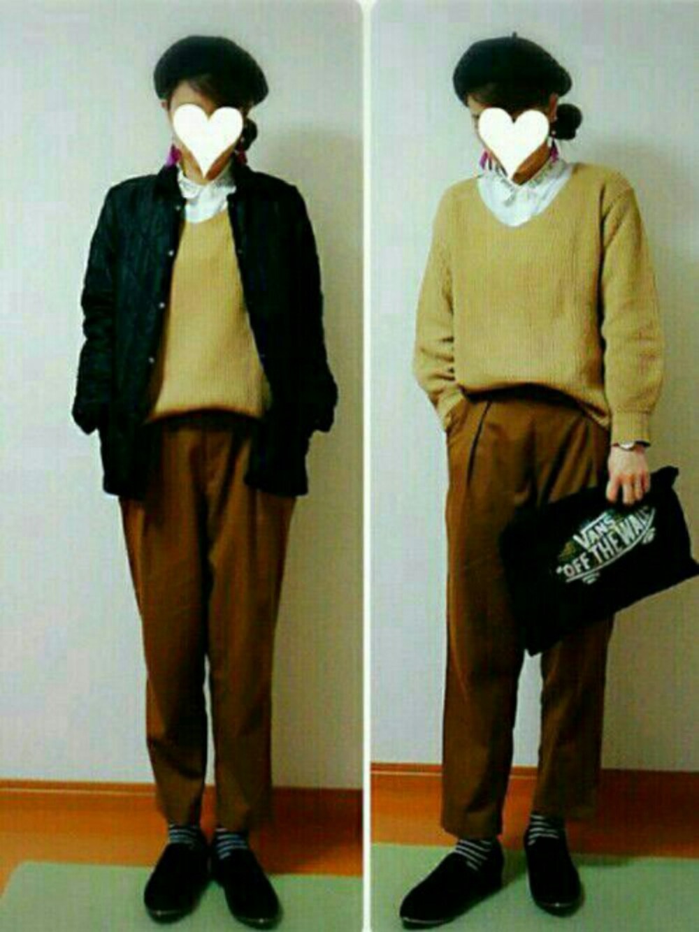 先日のコーデ😆 ベージュのワントーンコーデに黒小物プラス😊👍 ジャケットは18歳位にspick and span で買ったチョーふるかぶ😁まだまだ着れる丈夫な子です (小窓の画像は最近の商品を代用) いつも母コーデご覧くださりありがとーございます😆💕