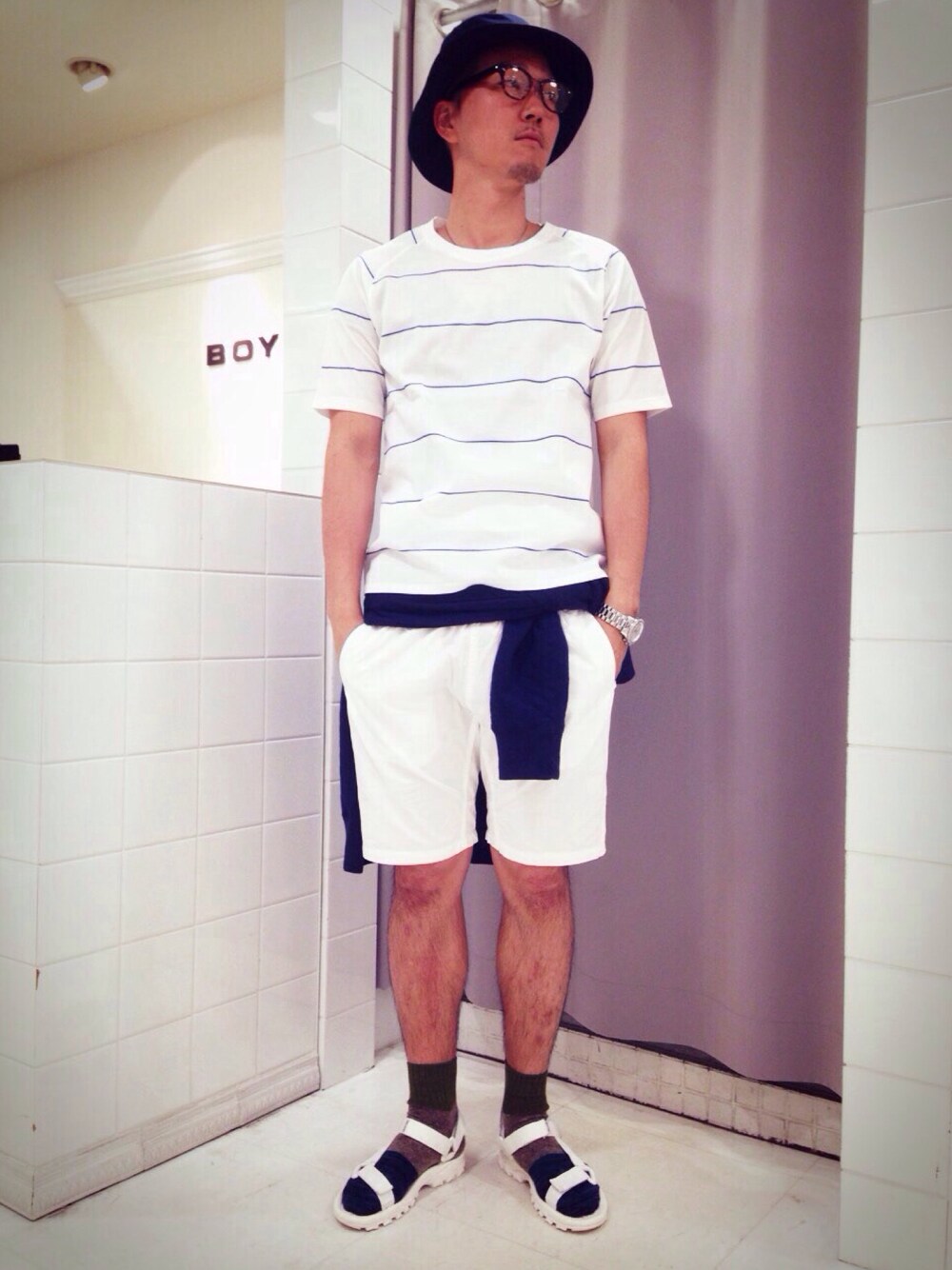 ハーフパンツ&テバサンダルを使用したスポーツミックススタイリング。 屋外で楽しむ夏のイベントにお勧めのコーディネートです。
