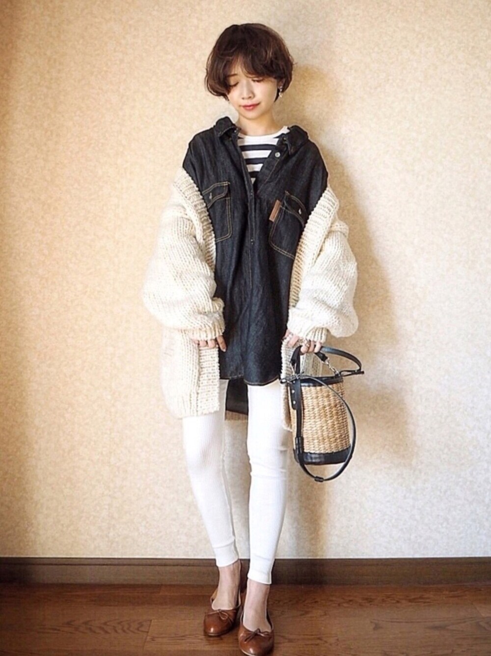ご覧頂きありがとうございます😊 今日はあったかい♡ デニムワンピにホワイトのリブレギンスを合わせました。 きのこ頭もポイント。