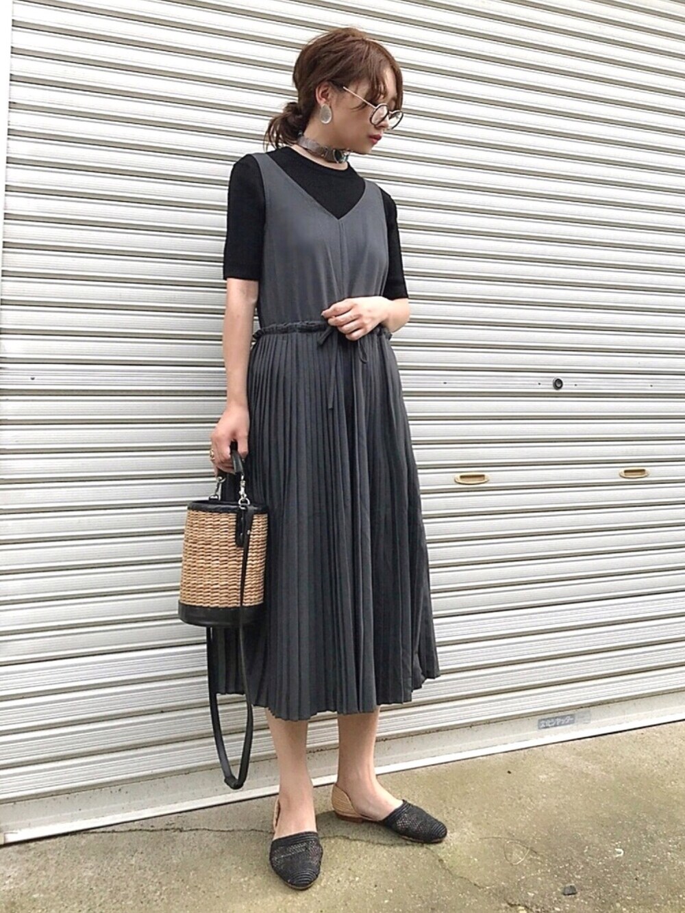 𝙔𝙐𝙆𝙄のワンピース「大人カワイイ。細プリーツワンピース(グレー)。Vネックの上品見えノースリーブドレス」を使ったコーディネート