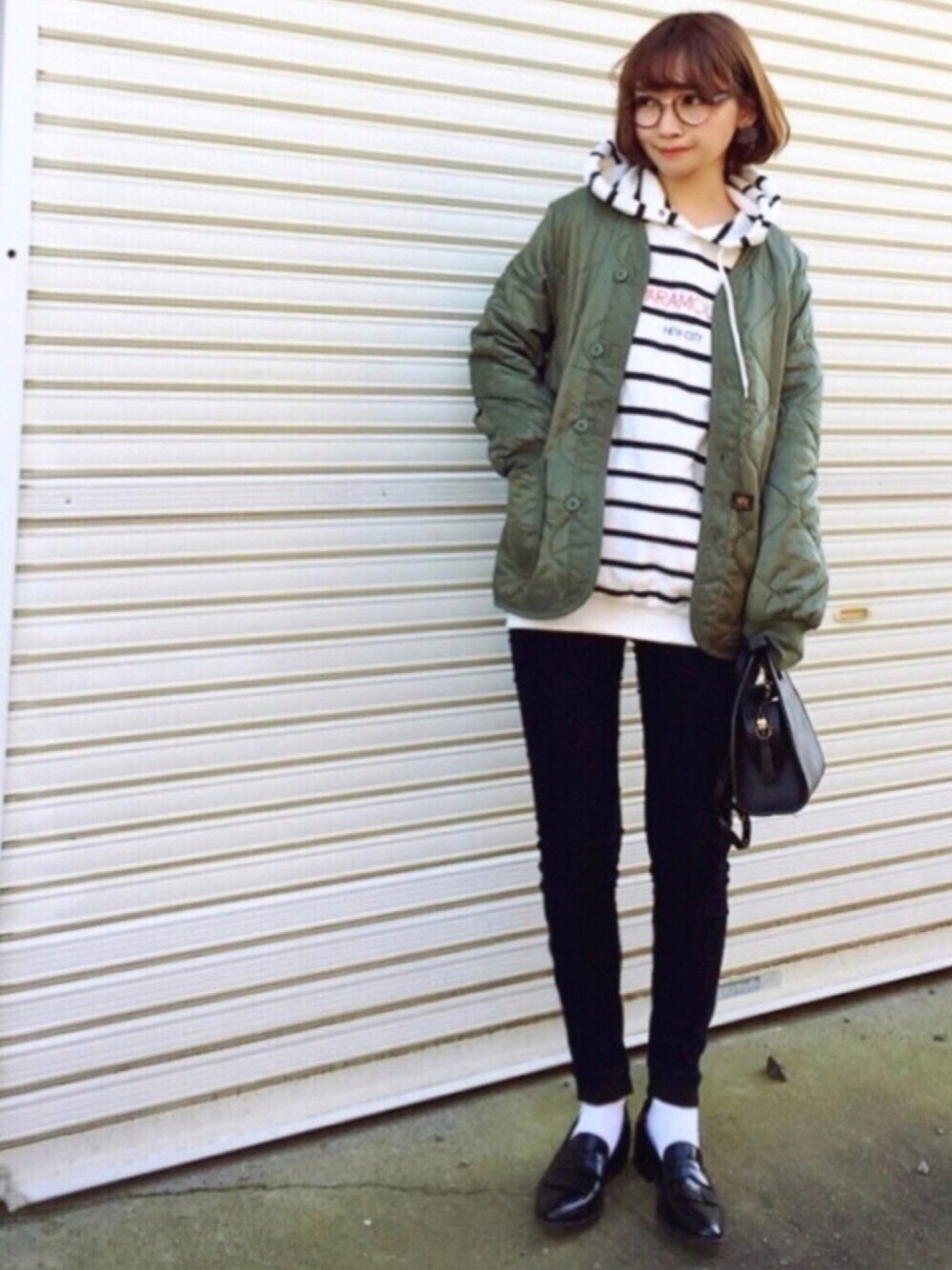 ご覧いただきありがとうございます😊 カーキのアウターばかりあって 緑買いすぎじゃね?ってよく言われます☺️ アルファのキルティングライナーは 緑具合と光沢が気に入ってます♡ メンズのXSです🤖 寒すぎて手を出さずにバッグを掴むという🤷♀️ このコーデ楽です🤦♂️