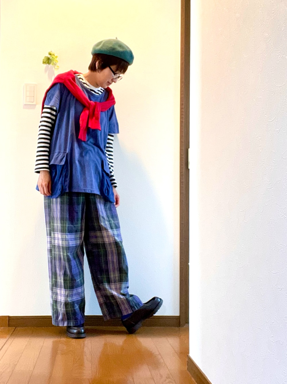 少し前に撮ったコーデ。 インナーに無印良品のボーダーロンTを着ました。 カーディガンで赤を足して🟥 少しフレンチカジュアルぽく🇫🇷 足元は、クレマンのチロリアンシューズ👞 ご覧頂きまして、どうもありがとうございました 🔴🔵⚪️👞👞👞