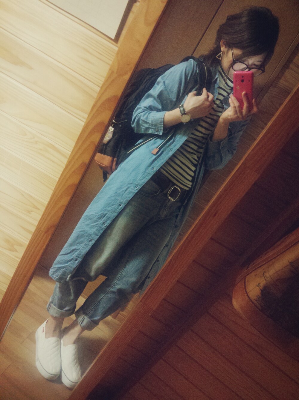 今日のコーデです🙆 フリマアプリで1300円で手に入れたデニムシャツワンピ✨ たくさん着まわします♡ デニデニです。 少し前なら、しなかったコーデ。。。今なら、アリかな?と🙈✨ いつもみてくれてありがとうございます🙌