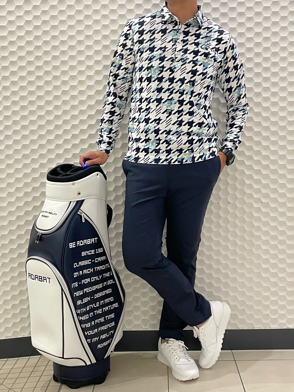 ヨシ(adabat)のポロシャツ「◆【UVカット/吸水速乾/遮熱】千鳥デザイン 長袖ポロシャツ」を使ったコーディネート