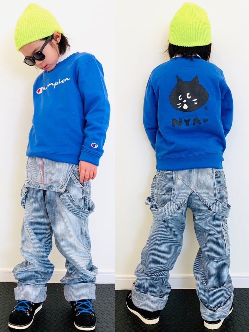 "にゃー× Champion"のスウェットに 春らしいヒッコリーストライプのオーバーホールを 合わせてみました ♡(´ε`〟) @nya_shop_official