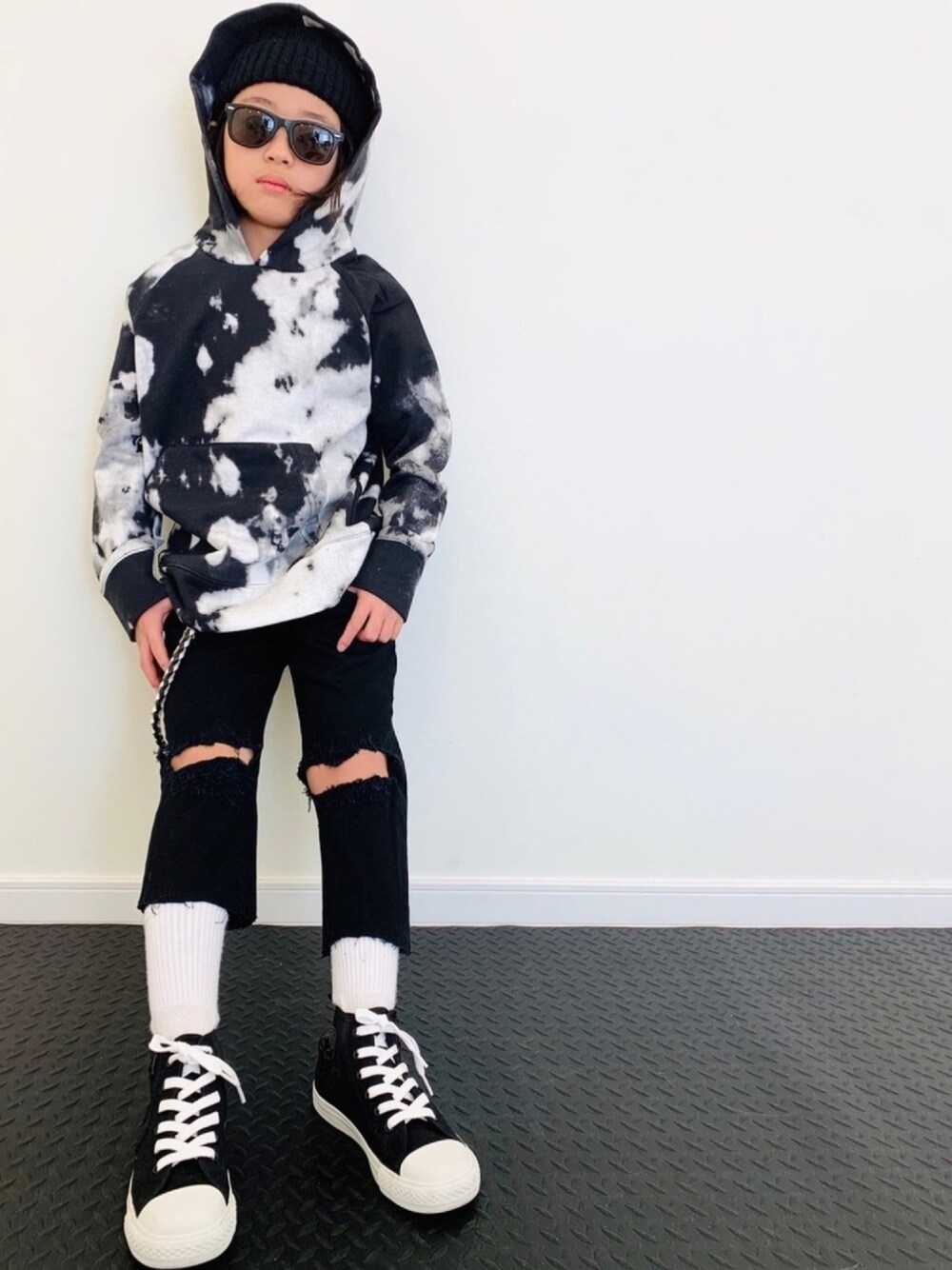 ブリーチ加工されたパーカーに パパがせっせとダメージ加工をほどこした パンツをあわせてみました ♪(´ε` )